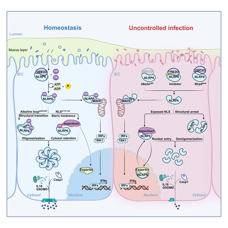 In summary, we identify UBE2O as a key post-translational regulator of NLRP6 and propose a dual-site monoubiquitination mechanism that ensures its specific activation, advancing our understanding of intestinal immunity and offering potential therapeutic insights.