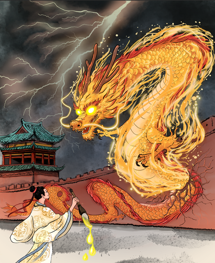 The Defining Touch: Much like the final brushstrokes that bring a painted dragon to life, UBE2O's two minimal ubiquitin modifications cooperatively transform dormant NLRP6 into its active form to combat pathogens.
